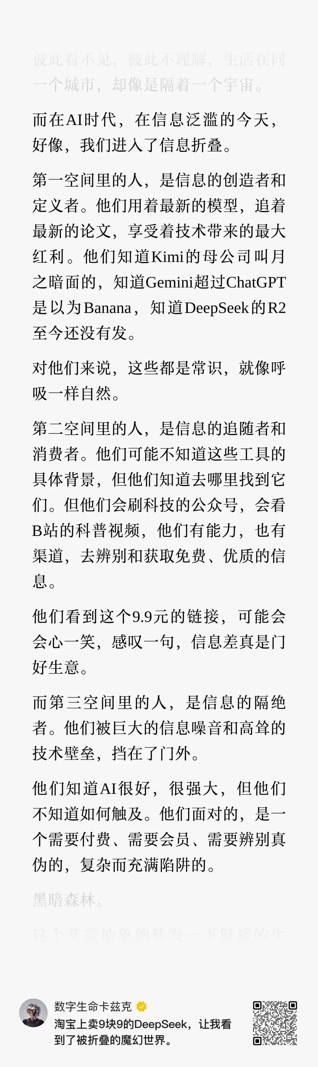 今天卡兹克老师那篇《 淘宝上卖9块9的DeepSeek,让我看到了被折叠的魔幻世界。》在 很多AI群里都引发了热烈的讨论。卡兹克老师提出了一个观点:“ 而在AI时代,在信息泛滥的今天,好像,我们进入了信息折叠 。 ”