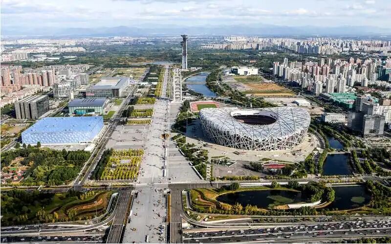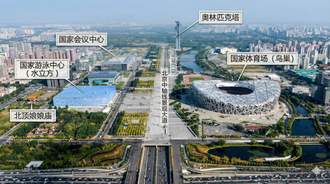 提示词:请标注附图北京鸟巢周边主要建筑物。比例16:9 。