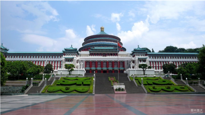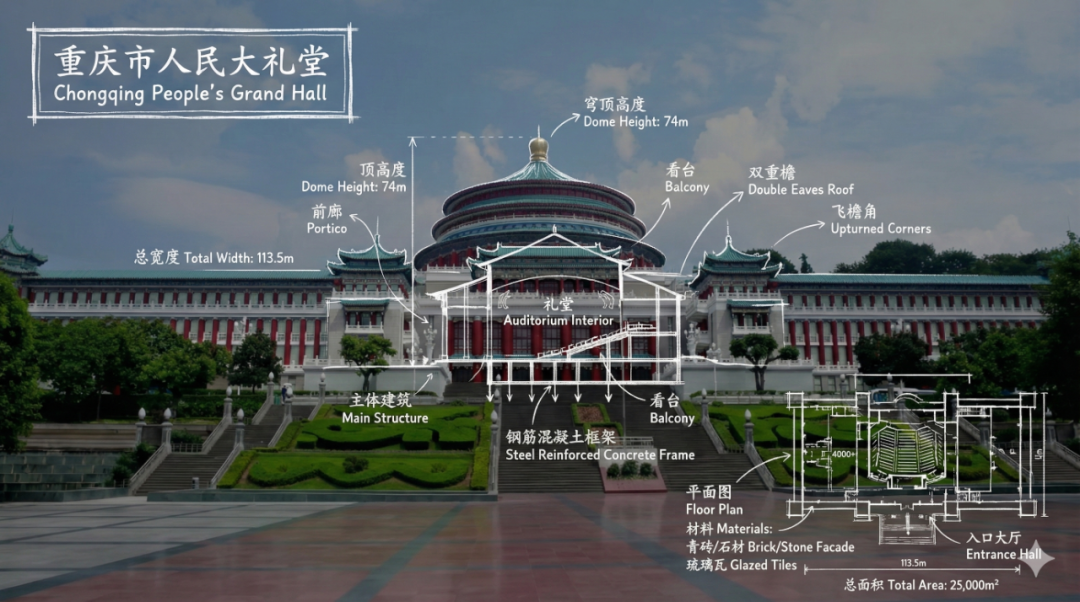 提示词:创建一幅关于的重庆市人民大礼堂的信息图表图像,将地标的有美感的真实照片(展示建筑的全貌)与叠加在图像上的蓝图风格技术注释和图表相结合。在角落的手绘框中包含标题“重庆市人民大礼堂”。添加白色粉笔风格的草图,展示关键结构数据、重要测量值、材料数量、内部图表、荷载流向箭头、横截面、平面图以及著名的建筑或工程特征。风格:照片上的蓝图美学,带有白色线条图,技术/建筑注释风格,教育信息图表的感觉,在注释后面可以看到真实的环境。标注文字用中英文两种语言表现。