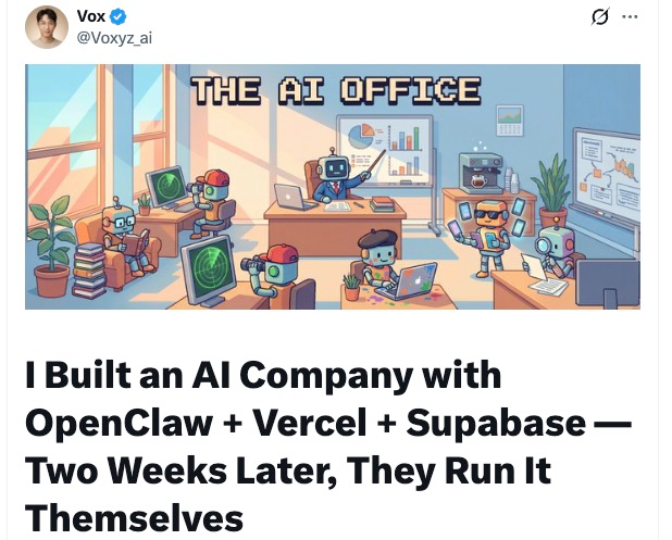 翻译过来就是:我用 OpenClaw + Vercel + Supabase 搭了一家 AI 公司,两周后,它们自己在运营了。